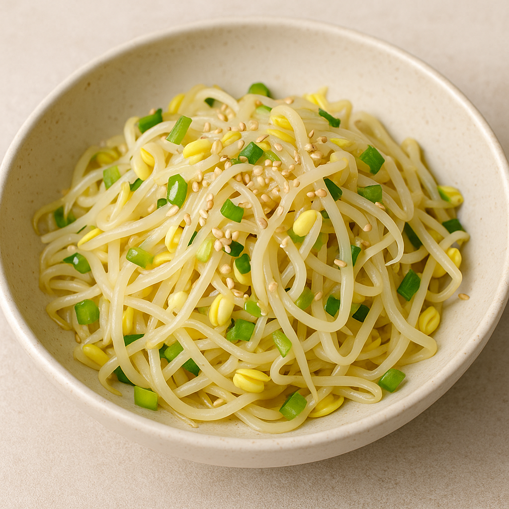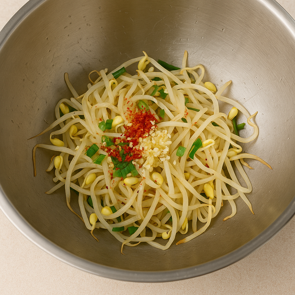 This dish typically features blanched soybean sprouts seasoned with sesame oil, garlic, scallions, salt, and sometimes gochugaru (Korean red pepper flakes).
